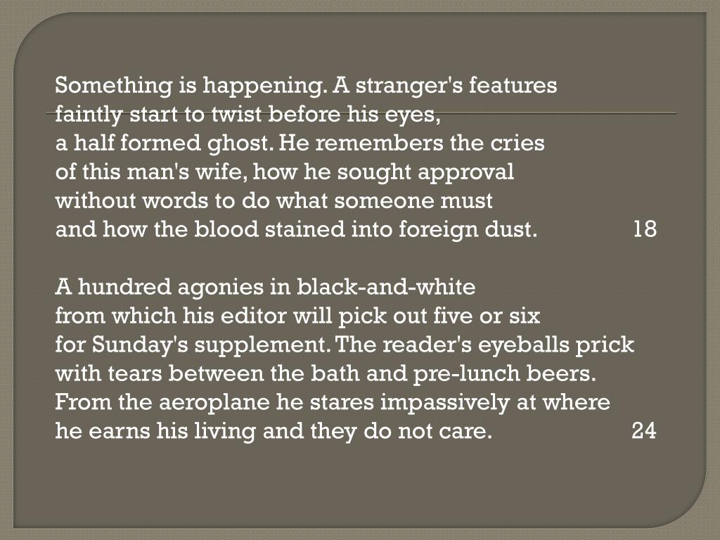 Markup End Rhyme Allusion Imagery Simile Consonance/AssonanceMetaphorAmbiguity Enjambment Third person pronoun Juxtaposition Something is happening. A stranger'sfeaturesfaintlystart to twist before his eyes,a half formed ghost.He remembers the criesof this man's wife, how hesought approvalwithoutwordsto do what someone mustand how the blood stained into foreign dust.A hundred agonies in black-and-whitefrom which his editor will pick out five or sixfor Sunday's supplement. The reader's eyeballs prickwith tearsbetween the bath and pre-lunch beers.From the aeroplanehe stares impassively at whereheearns his living and they do not care.