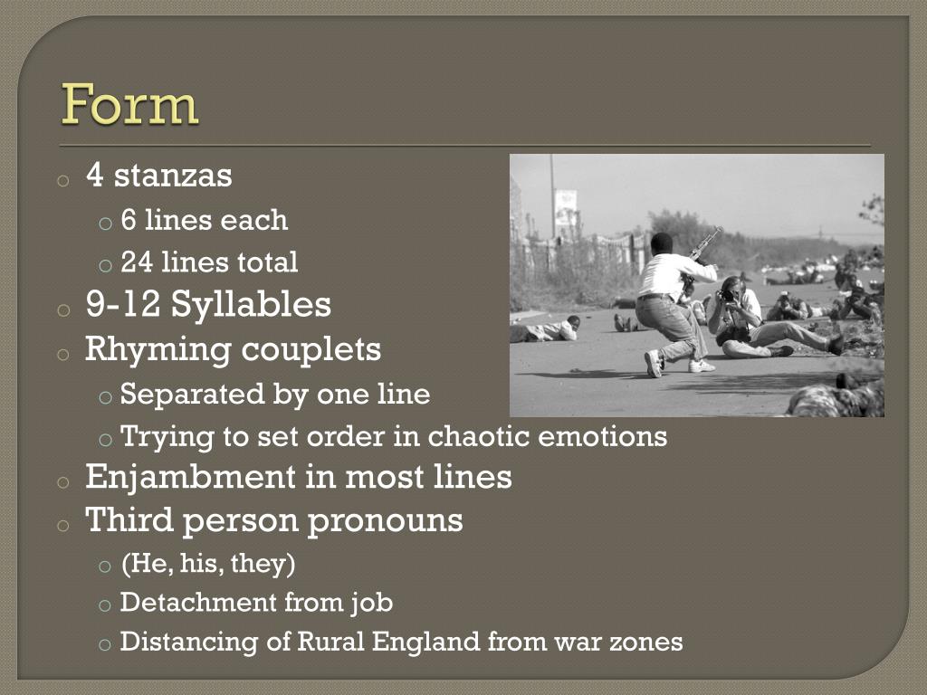 Form • 4 stanzas • 6 lines each • 24 lines total • 9-12 Syllables • Rhyming couplets • Separated by one line • Trying to set order in chaotic emotions • Enjambment in most lines • Third person pronouns • (He, his, they) • Detachment from job • Distancing of Rural England from war zones