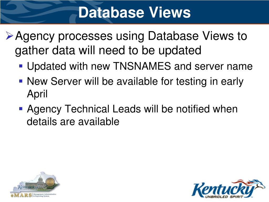 Database Views • Agency processes using Database Views to gather data will need to be updated • Updated with new TNSNAMES and server name • New Server will be available for testing in early April • Agency Technical Leads will be notified when details are available