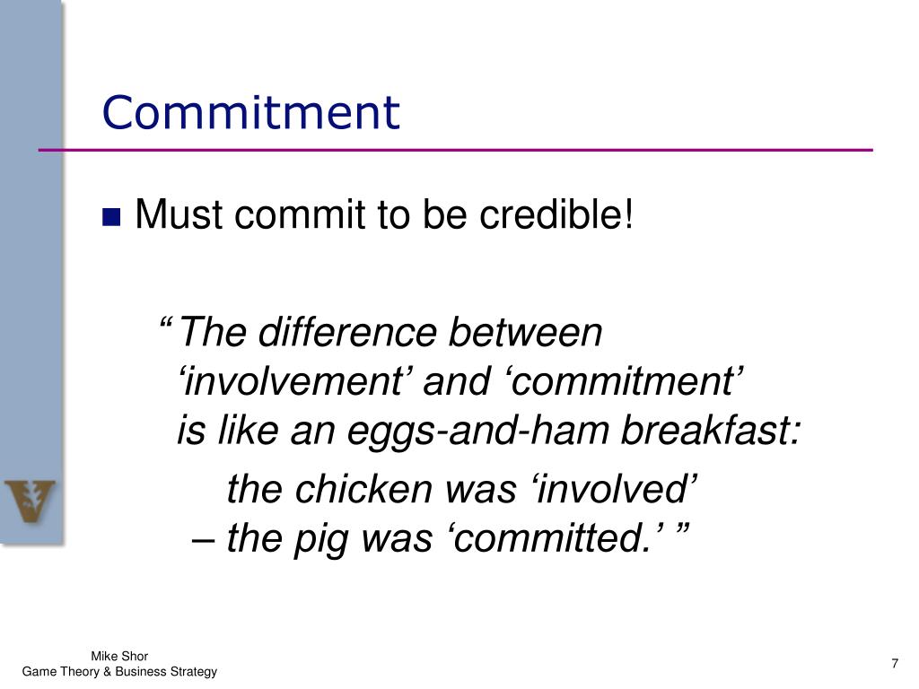 Commitment • Must commit to be credible! “ The difference between ‘involvement’ and ‘commitment’ is like an eggs-and-ham breakfast: the chicken was ‘involved’ – the pig was ‘committed.’ ”