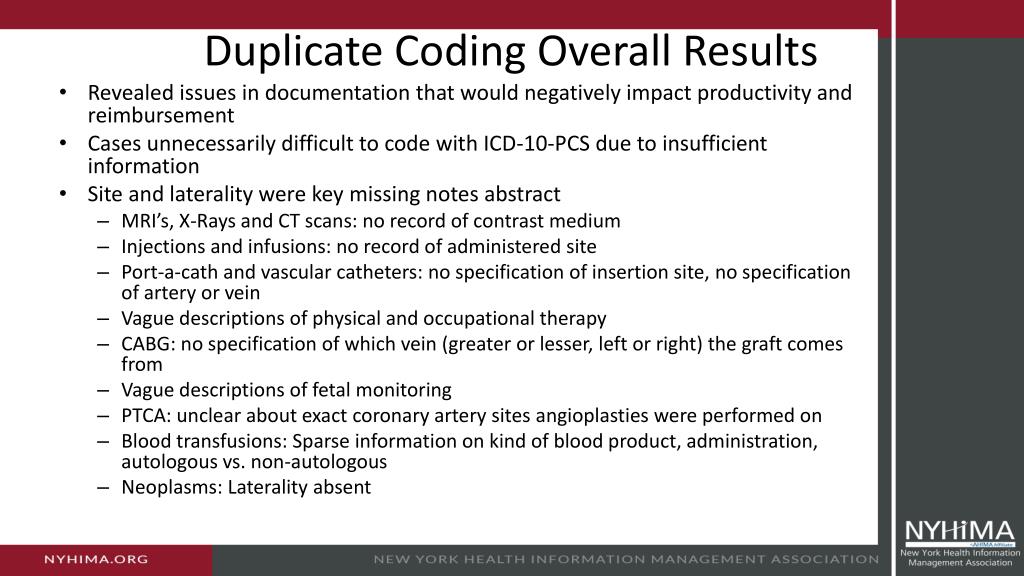 Duplicate Coding Overall Results • Revealed issues in documentation that would negatively impact productivity and reimbursement • Cases unnecessarily difficult to code with ICD-10-PCS due to insufficient information • Site and laterality were key missing notes abstract • MRI’s, X-Rays and CT scans: no record of contrast medium • Injections and infusions: no record of administered site • Port-a-cath and vascular catheters: no specification of insertion site, no specification of artery or vein • Vague descriptions of physical and occupational therapy • CABG: no specification of which vein (greater or lesser, left or right) the graft comes from • Vague descriptions of fetal monitoring • PTCA: unclear about exact coronary artery sites angioplasties were performed on • Blood transfusions: Sparse information on kind of blood product, administration, autologous vs. non-autologous • Neoplasms: Laterality absent