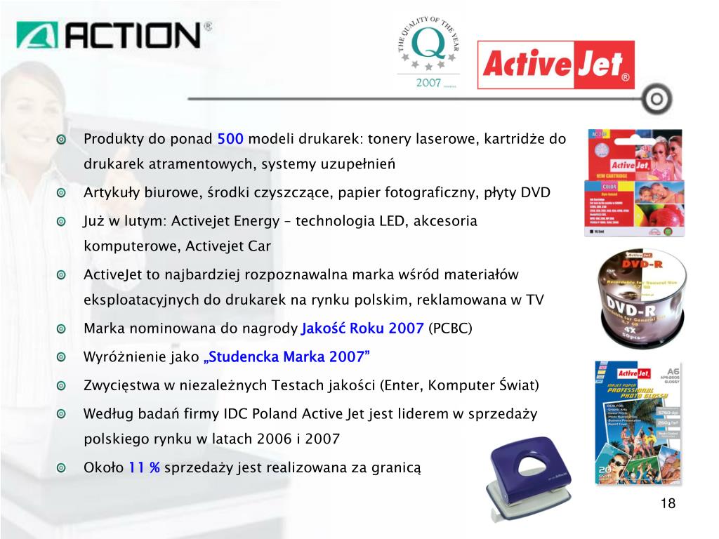 Produkty do ponad 500 modeli drukarek: tonery laserowe, kartridże do drukarek atramentowych, systemy uzupełnień • Artykuły biurowe, środki czyszczące, papier fotograficzny, płyty DVD • Już w lutym: Activejet Energy – technologia LED, akcesoria komputerowe, Activejet Car • ActiveJet to najbardziej rozpoznawalna marka wśród materiałów eksploatacyjnych do drukarek na rynku polskim, reklamowana w TV • Marka nominowana do nagrody Jakość Roku 2007 (PCBC) • Wyróżnienie jako „Studencka Marka 2007” • Zwycięstwa w niezależnych Testach jakości (Enter, Komputer Świat) • Według badań firmy IDC Poland Active Jet jest liderem w sprzedaży polskiego rynku w latach 2006 i 2007 • Około 11 % sprzedaży jest realizowana za granicą