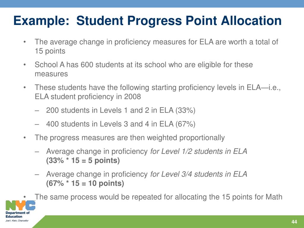 Student Progress: Point Allocation Student Progress is 60 points (out of 100) which are allocated to the progress measures as defined in the table below *Note: if a school has fewer than 15 students who take the ELA or Math State tests, the points for that subject would be re-allocated to the other subject