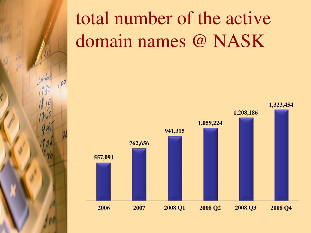 NASK efforts to promote domain names registrations • public meetings with Partners; • conferences dedicated to the Aftermarket:SecondaryMarket.pl and SecondaryMarket2009.pl • TV interviews, press releases; • on-line BLOG: webhosting.pl/bartosiewicz • reports (quarter and annual) and more… www.dns.pl; example:http://dns.pl/Raport2008.pdfhttp://dns.pl/news/Raport_kwartalny_Q1_2009.pdf