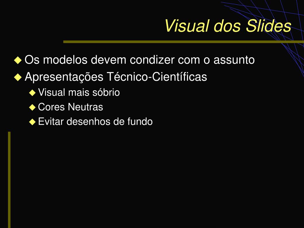 Visual dos Slides • Os modelos devem condizer com o assunto • Apresentações Técnico-Científicas • Visual mais sóbrio • Cores Neutras • Evitar desenhos de fundo