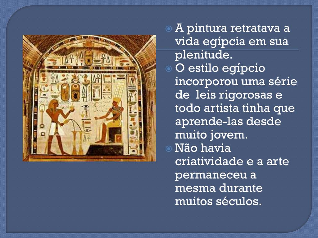 A pintura retratava a vida egípcia em sua plenitude. • O estilo egípcio incorporou uma série de leis rigorosas e todo artista tinha que aprende-las desde muito jovem. • Não havia criatividade e a arte permaneceu a mesma durante muitos séculos.