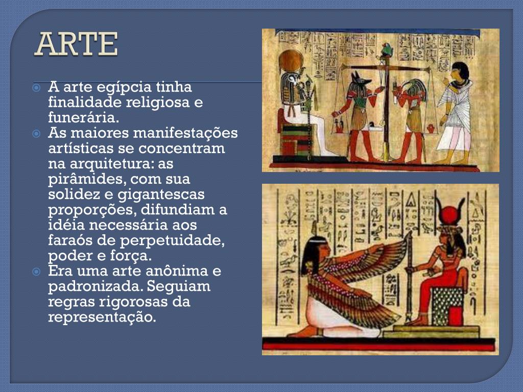 ARTE A arte egípcia tinha finalidade religiosa e funerária. As maiores manifestações artísticas se concentram na arquitetura: as pirâmides, com sua solidez e gigantescas proporções, difundiam a idéia necessária aos faraós de perpetuidade, poder e força. Era uma arte anônima e padronizada. Seguiam regras rigorosas da representação.