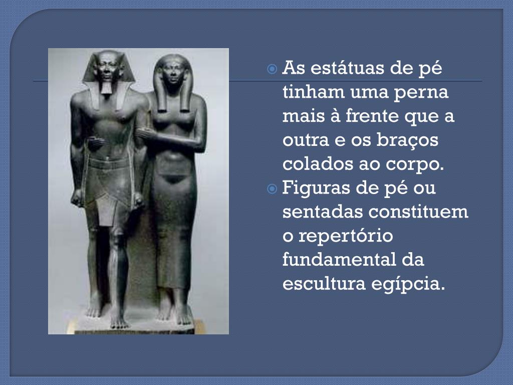 As estátuas de pé tinham uma perna mais à frente que a outra e os braços colados ao corpo. • Figuras de pé ou sentadas constituem o repertório fundamental da escultura egípcia.