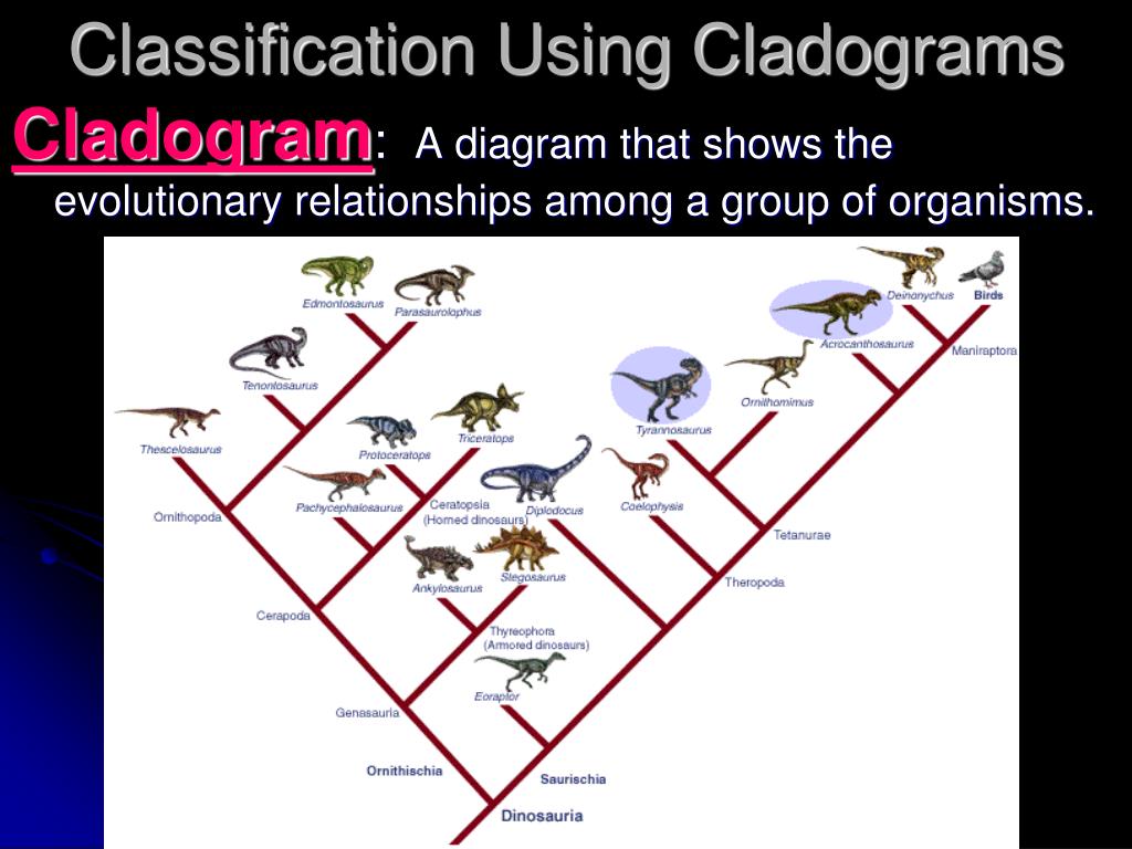 Classification Using Cladograms Cladogram: A diagram that shows the evolutionary relationships among a group of organisms.
