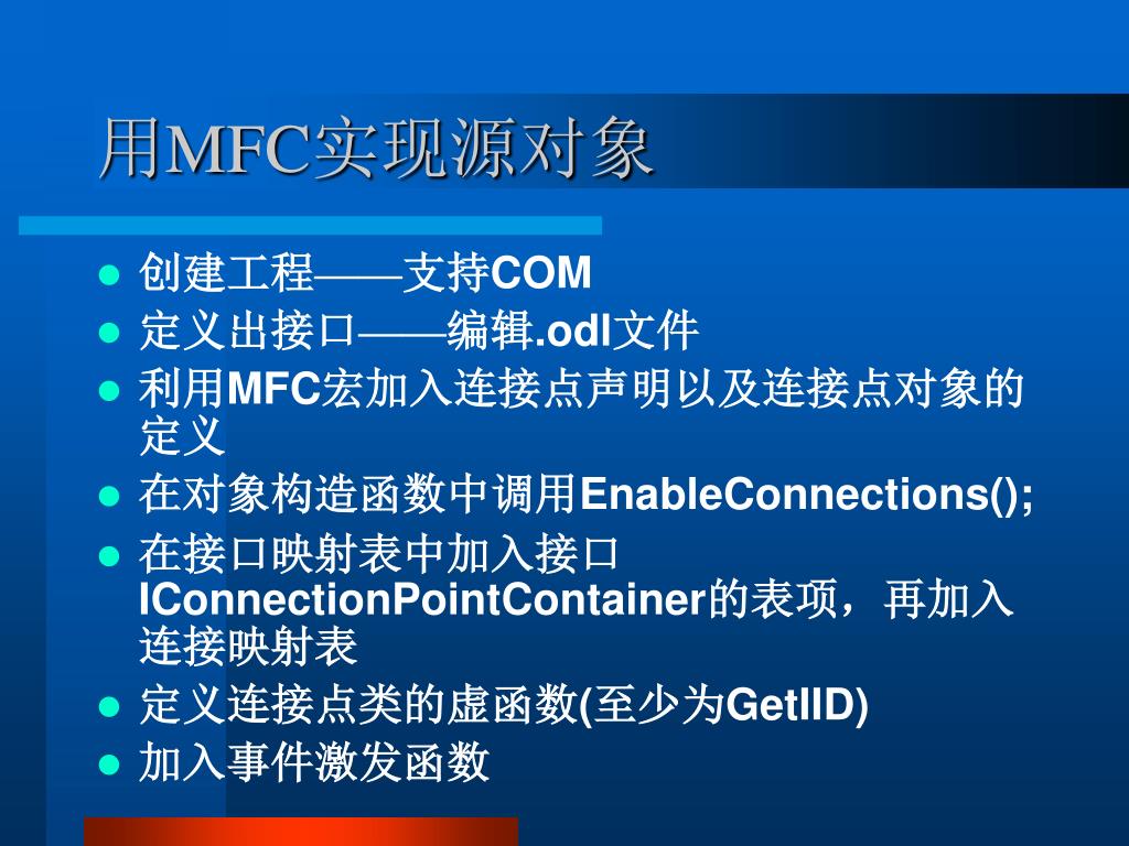 用MFC实现源对象 • 创建工程——支持COM • 定义出接口——编辑.odl文件 • 利用MFC宏加入连接点声明以及连接点对象的定义 • 在对象构造函数中调用EnableConnections(); • 在接口映射表中加入接口IConnectionPointContainer的表项,再加入连接映射表 • 定义连接点类的虚函数(至少为GetIID) • 加入事件激发函数