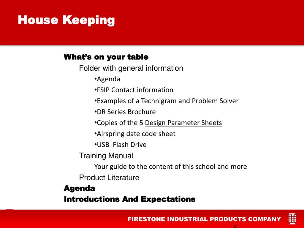 What’s on your table Folder with general information Agenda FSIP Contact information Examples of a Technigram and Problem Solver DR Series Brochure Copies of the 5 Design Parameter Sheets Airspring date code sheet USB Flash Drive Training Manual Your guide to the content of this school and more Product Literature Agenda Introductions And Expectations House Keeping
