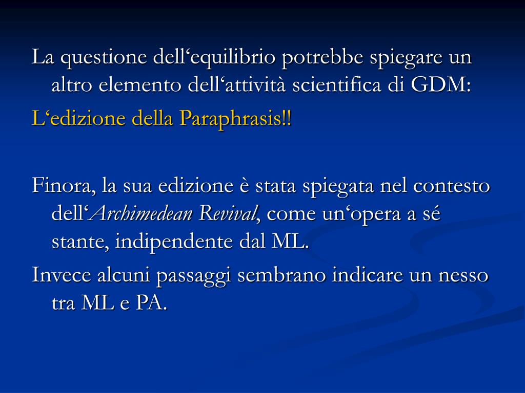La questione dell‘equilibrio potrebbe spiegare un altro elemento dell‘attività scientifica di GDM: L‘edizione della Paraphrasis!! Finora, la sua edizione è stata spiegata nel contesto dell‘Archimedean Revival, come un‘opera a sé stante, indipendente dal ML. Invece alcuni passaggi sembrano indicare un nesso tra ML e PA.