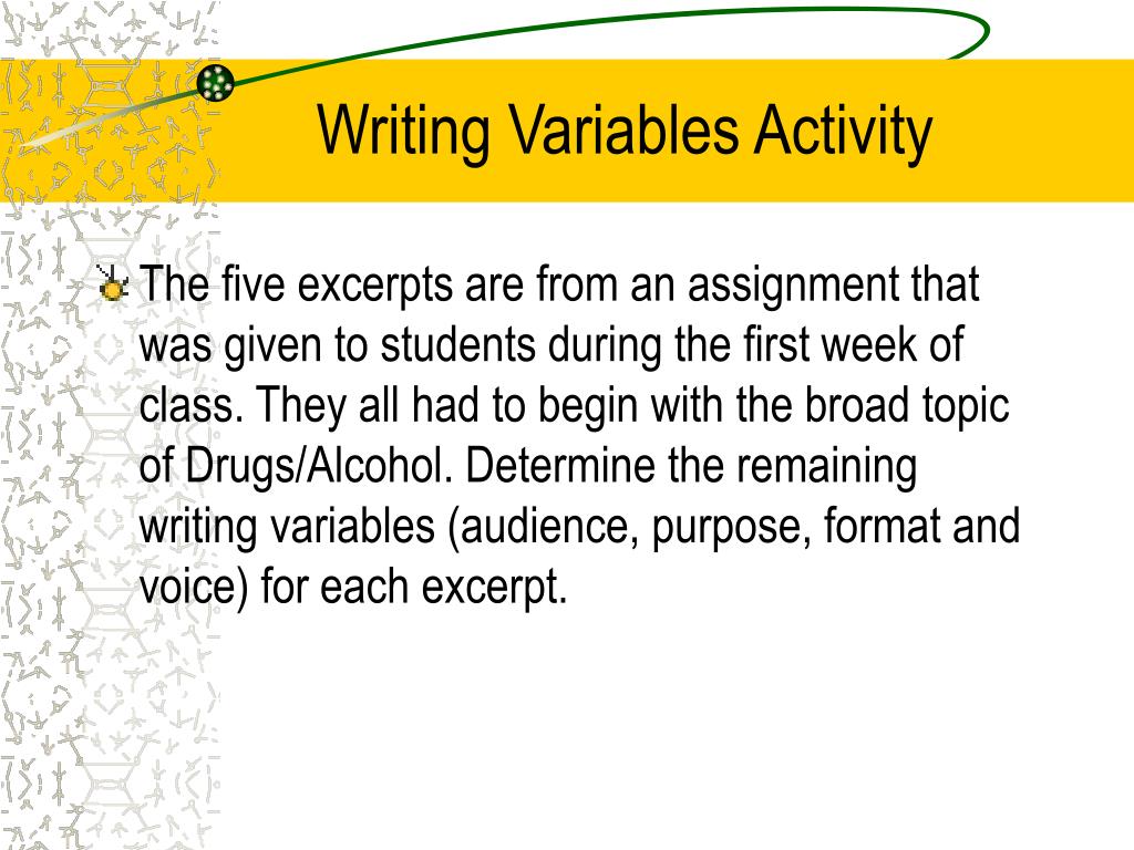 Writing Variables Activity • The five excerpts are from an assignment that was given to students during the first week of class. They all had to begin with the broad topic of Drugs/Alcohol. Determine the remaining writing variables (audience, purpose, format and voice) for each excerpt.