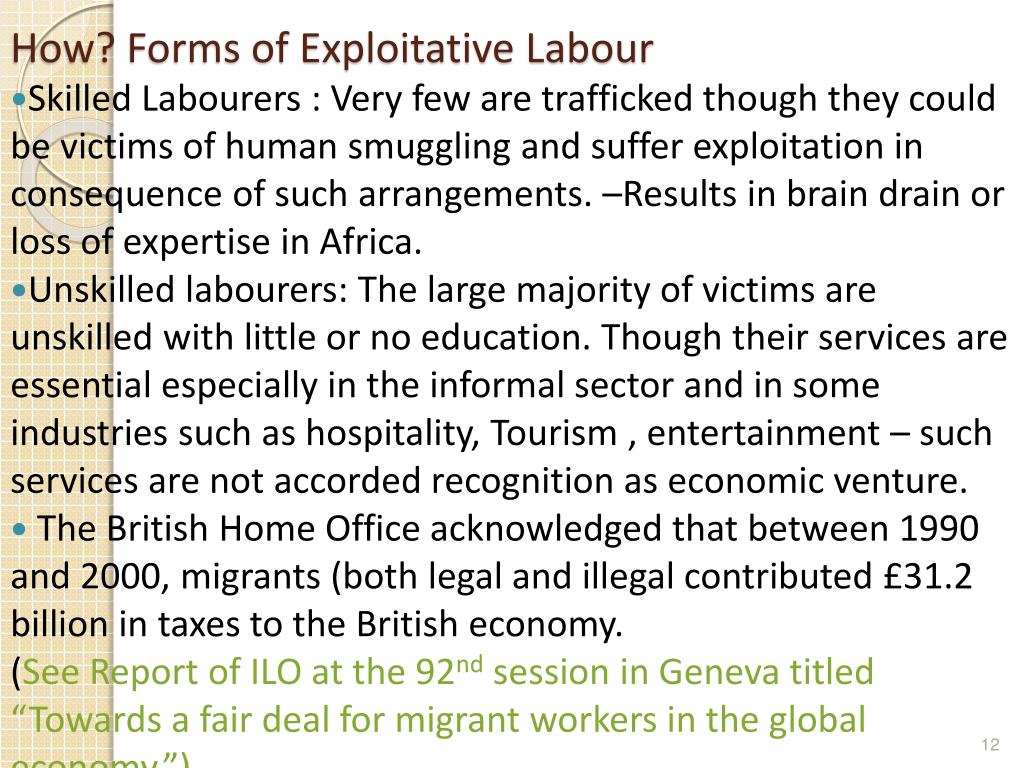 How? Forms of Exploitative Labour • Skilled Labourers : Very few are trafficked though they could be victims of human smuggling and suffer exploitation in consequence of such arrangements. –Results in brain drain or loss of expertise in Africa. • Unskilled labourers: The large majority of victims are unskilled with little or no education. Though their services are essential especially in the informal sector and in some industries such as hospitality, Tourism , entertainment – such services are not accorded recognition as economic venture. • The British Home Office acknowledged that between 1990 and 2000, migrants (both legal and illegal contributed £31.2 billion in taxes to the British economy. (See Report of ILO at the 92nd session in Geneva titled “Towards a fair deal for migrant workers in the global economy,”)