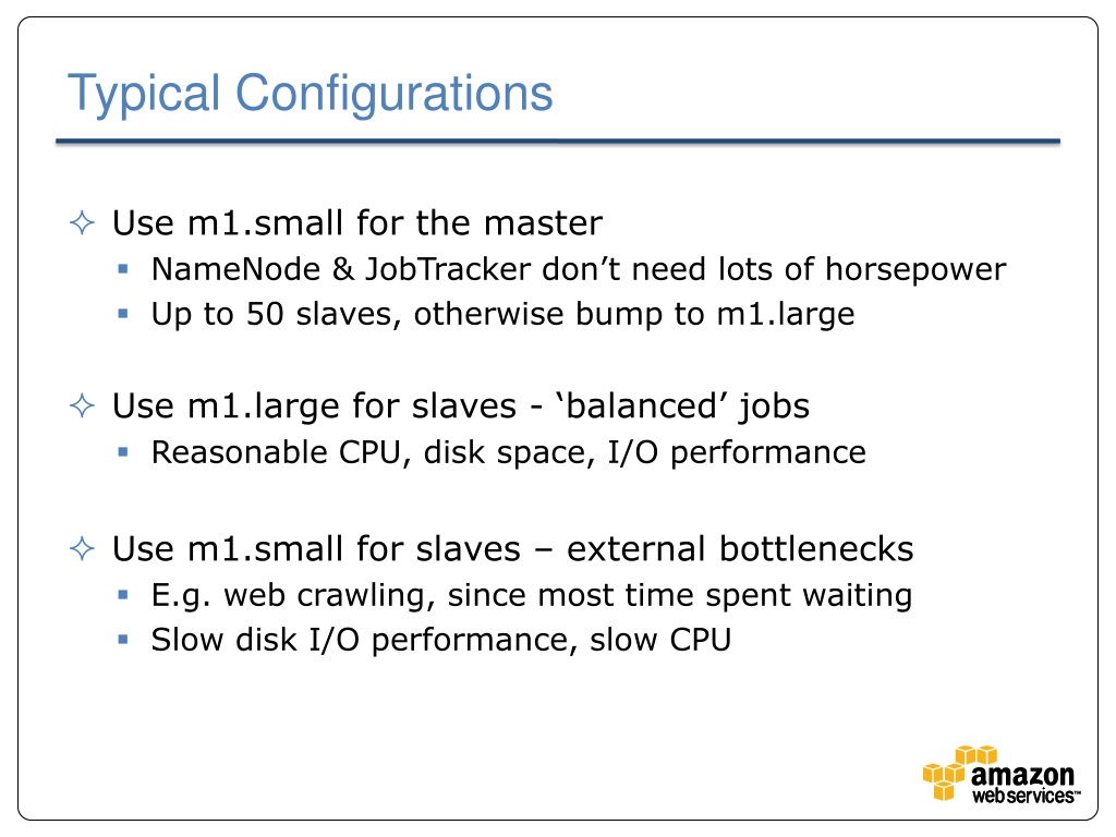 Typical Configurations • Use m1.small for the master • NameNode & JobTracker don’t need lots of horsepower • Up to 50 slaves, otherwise bump to m1.large • Use m1.large for slaves - ‘balanced’ jobs • Reasonable CPU, disk space, I/O performance • Use m1.small for slaves – external bottlenecks • E.g. web crawling, since most time spent waiting • Slow disk I/O performance, slow CPU