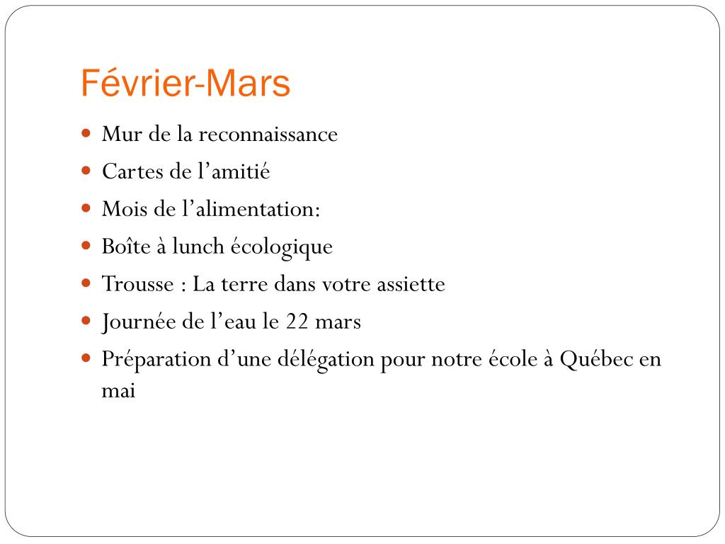 Février-Mars • Mur de la reconnaissance • Cartes de l’amitié • Mois de l’alimentation: • Boîte à lunch écologique • Trousse : La terre dans votre assiette • Journée de l’eau le 22 mars • Préparation d’une délégation pour notre école à Québec en mai