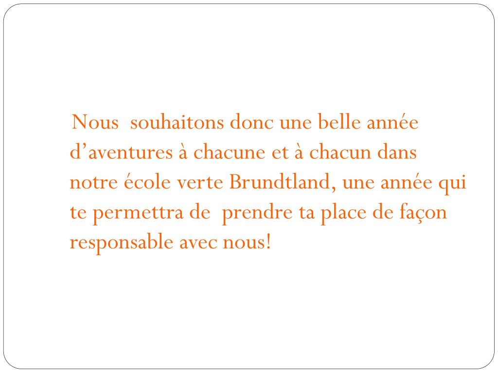 Nous souhaitons donc une belle année d’aventures à chacune et à chacun dans notre école verte Brundtland, une année qui te permettra de prendre ta place de façon responsable avec nous!