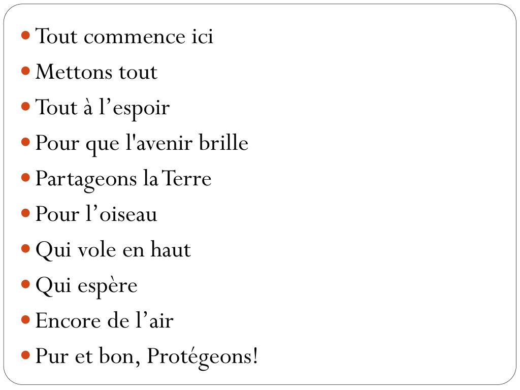 Tout commence ici • Mettons tout • Tout à l’espoir • Pour que l'avenir brille • Partageons la Terre • Pour l’oiseau • Qui vole en haut • Qui espère • Encore de l’air • Pur et bon, Protégeons!