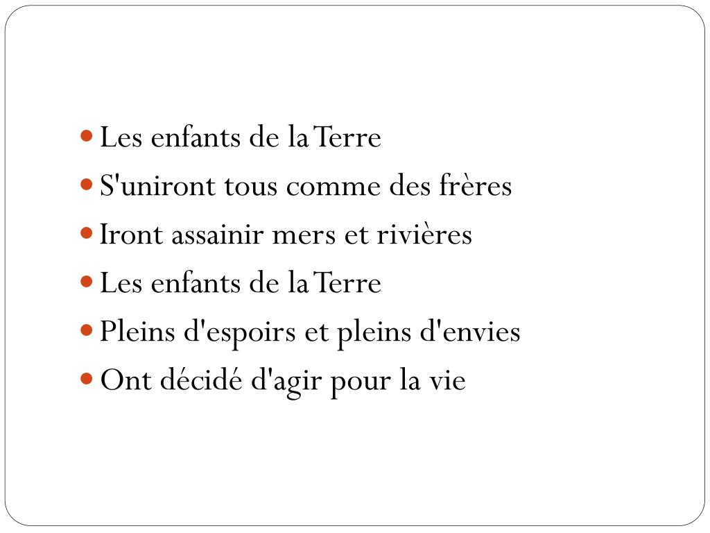 Les enfants de la Terre • S'uniront tous comme des frères • Iront assainir mers et rivières • Les enfants de la Terre • Pleins d'espoirs et pleins d'envies • Ont décidé d'agir pour la vie
