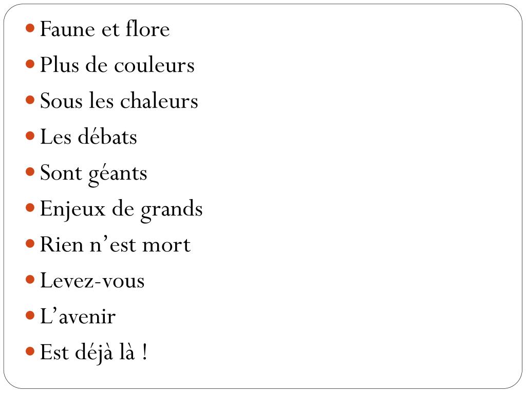 Faune et flore • Plus de couleurs • Sous les chaleurs • Les débats • Sont géants • Enjeux de grands • Rien n’est mort • Levez-vous • L’avenir • Est déjà là !
