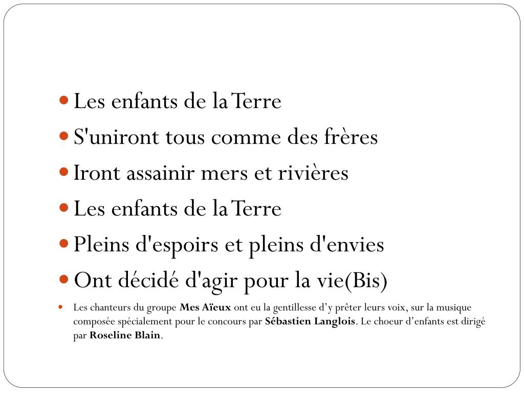Les enfants de la Terre • S'uniront tous comme des frères • Iront assainir mers et rivières • Les enfants de la Terre • Pleins d'espoirs et pleins d'envies • Ont décidé d'agir pour la vie(Bis) • Les chanteurs du groupe Mes Aïeux ont eu la gentillesse d’y prêter leurs voix, sur la musique composée spécialement pour le concours par Sébastien Langlois. Le choeur d’enfants est dirigé par Roseline Blain.