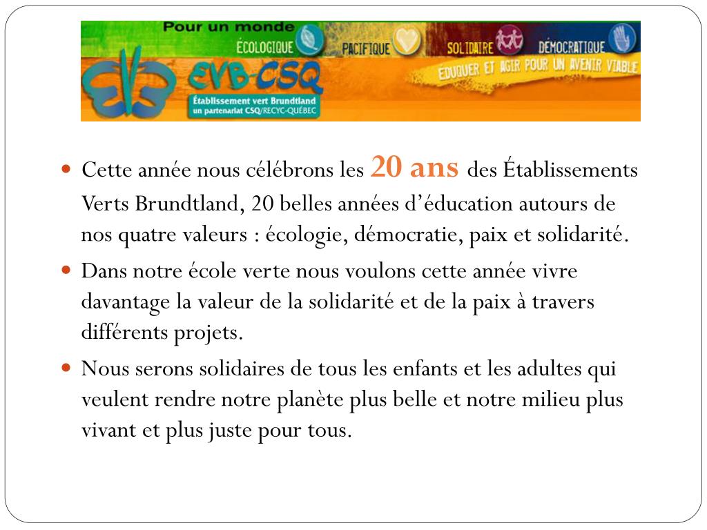Cette année nous célébrons les 20 ans des Établissements Verts Brundtland, 20 belles années d’éducation autours de nos quatre valeurs : écologie, démocratie, paix et solidarité. • Dans notre école verte nous voulons cette année vivre davantage la valeur de la solidarité et de la paix à travers différents projets. • Nous serons solidaires de tous les enfants et les adultes qui veulent rendre notre planète plus belle et notre milieu plus vivant et plus juste pour tous.