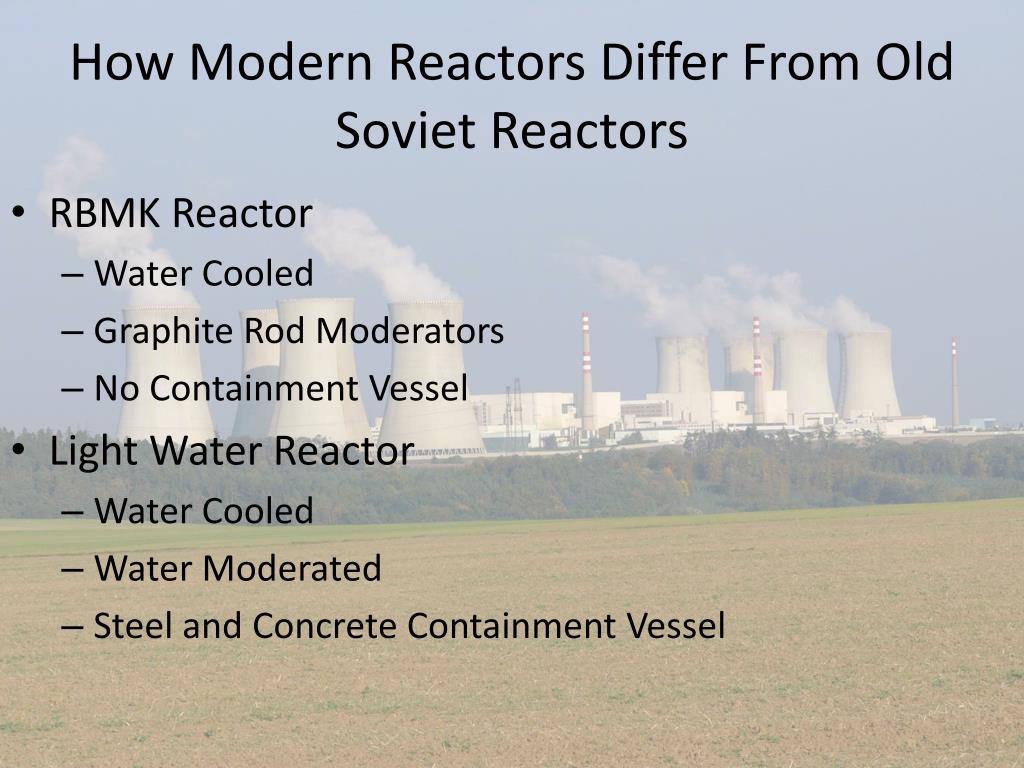How Modern Reactors Differ From Old Soviet Reactors • RBMK Reactor • Water Cooled • Graphite Rod Moderators • No Containment Vessel • Light Water Reactor • Water Cooled • Water Moderated • Steel and Concrete Containment Vessel