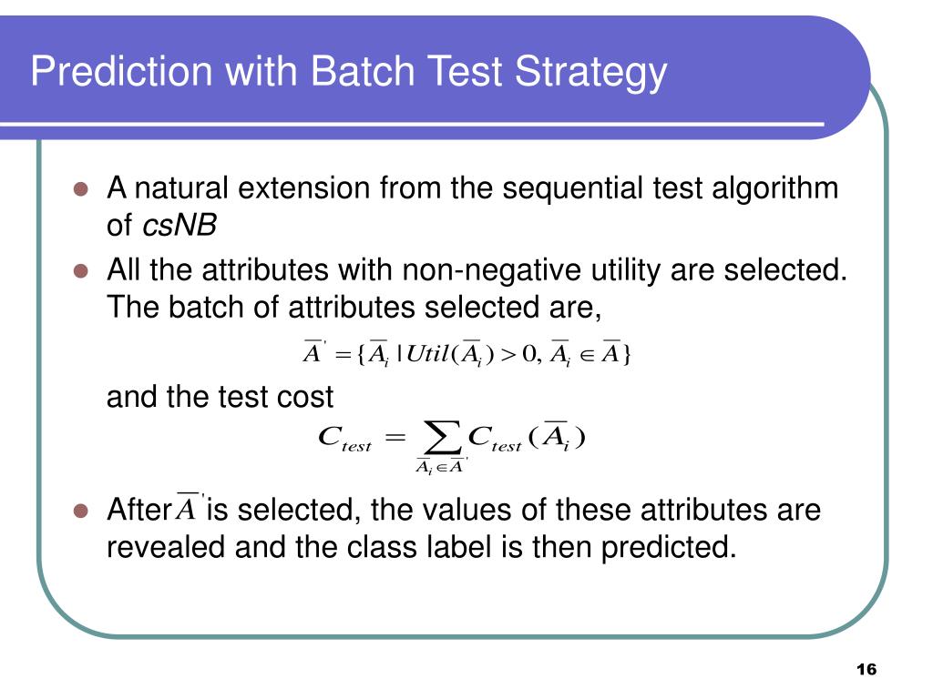 Prediction with Batch Test Strategy • A natural extension from the sequential test algorithm of csNB • All the attributes with non-negative utility are selected. The batch of attributes selected are, and the test cost • After is selected, the values of these attributes are revealed and the class label is then predicted.