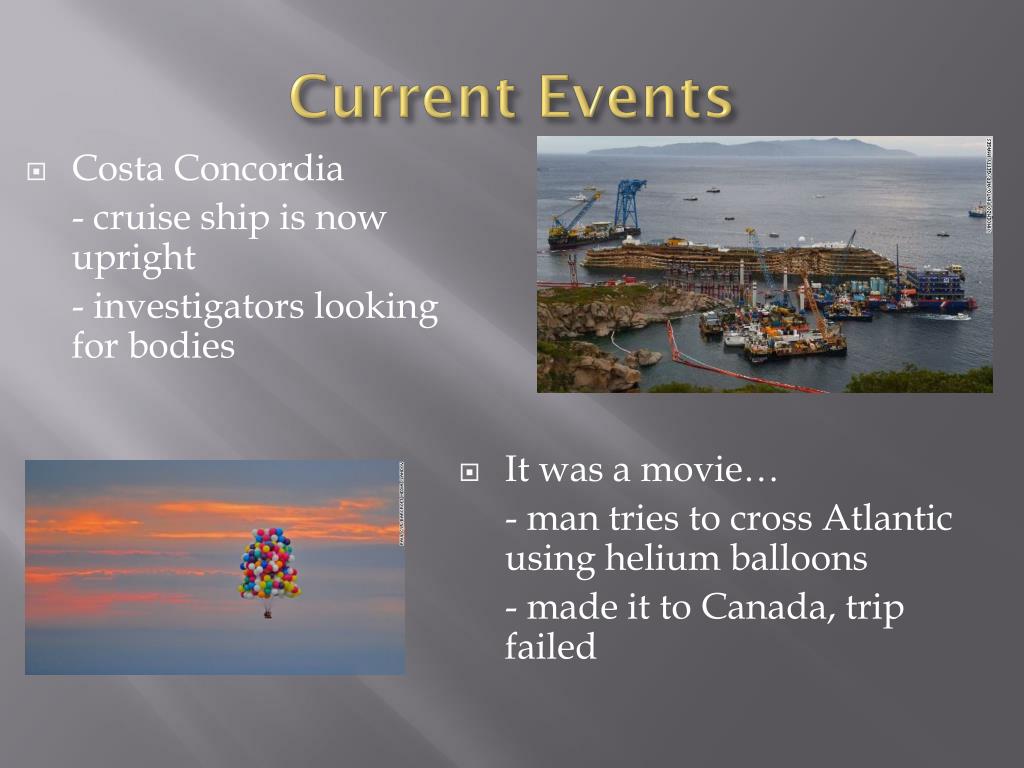 Current Events • Costa Concordia - cruise ship is now upright - investigators looking for bodies • It was a movie… - man tries to cross Atlantic using helium balloons - made it to Canada, trip failed