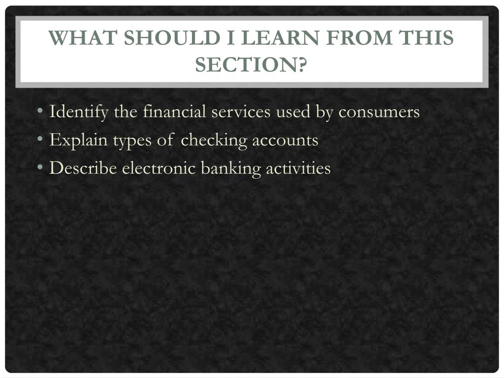 What Should I Learn From this Section? • Identify the financial services used by consumers • Explain types of checking accounts • Describe electronic banking activities