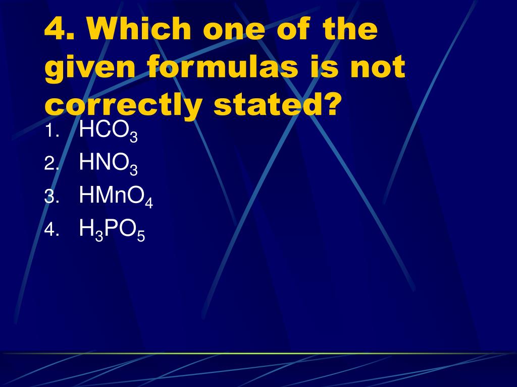 4. Which one of the given formulas is not correctly stated? • HCO3 • HNO3 • HMnO4 • H3PO5