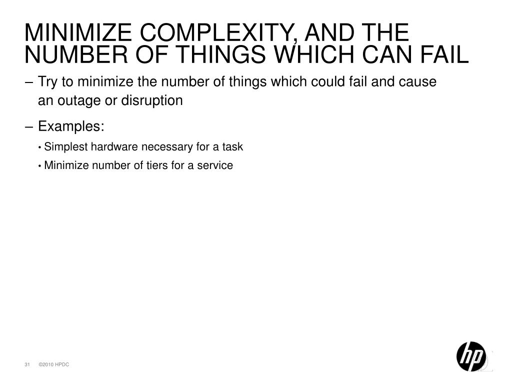 HP Restricted Reduce the extent of impact of a failure • Anything connected together might interact • Try not to connect together redundant components • Sometimes an inoperative component can prevent another redundant component from working • Incorporate into the system design ways of removing, isolating, or avoiding the use of a failed component