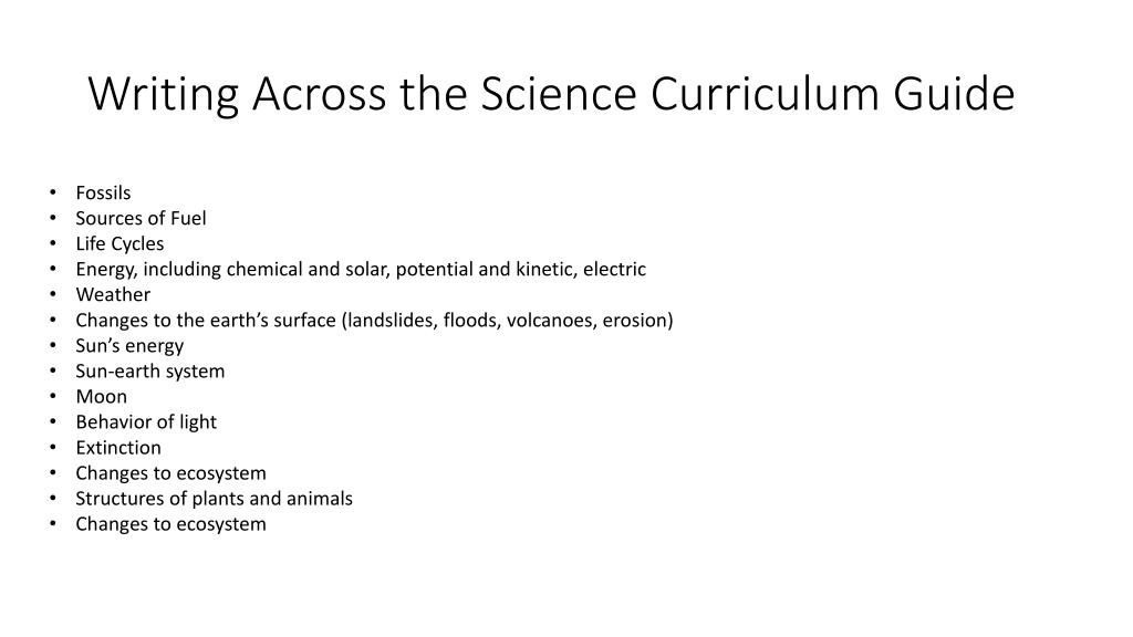 Writing Across the Science Curriculum Guide • Fossils • Sources of Fuel • Life Cycles • Energy, including chemical and solar, potential and kinetic, electric • Weather • Changes to the earth’s surface (landslides, floods, volcanoes, erosion) • Sun’s energy • Sun-earth system • Moon • Behavior of light • Extinction • Changes to ecosystem • Structures of plants and animals • Changes to ecosystem