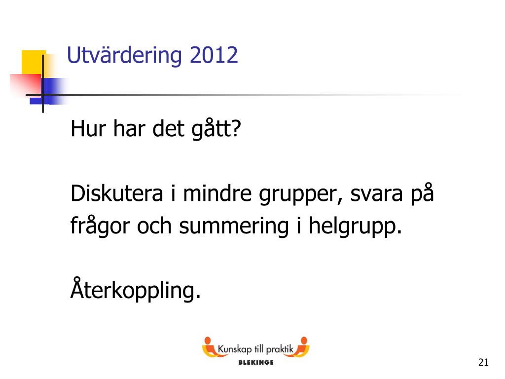 Utvärdering 2012 Hur har det gått? Diskutera i mindre grupper, svara på frågor och summering i helgrupp. Återkoppling.