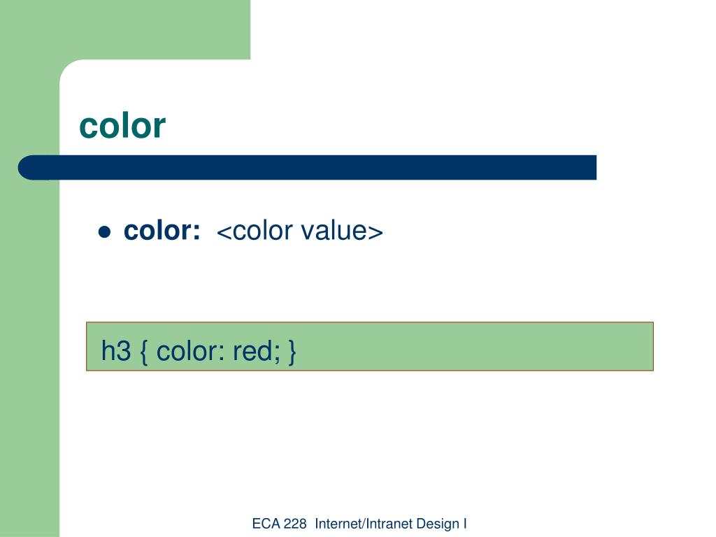 color • color: <color value> h3 { color: red; } ECA 228 Internet/Intranet Design I
