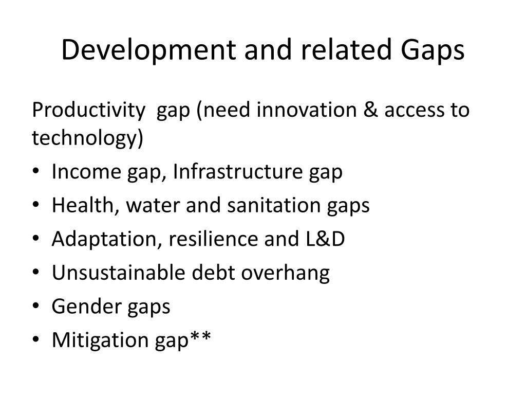 Development and related Gaps Productivity gap (need innovation & access to technology) • Income gap, Infrastructure gap • Health, water and sanitation gaps • Adaptation, resilience and L&D • Unsustainable debt overhang • Gender gaps • Mitigation gap**