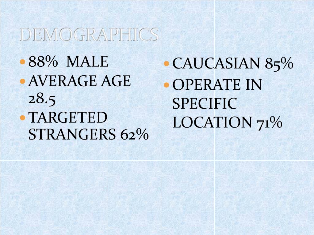 88% MALE AVERAGE AGE 28.5 TARGETED STRANGERS 62% CAUCASIAN 85% OPERATE IN SPECIFIC LOCATION 71% DEMOGRAPHICS