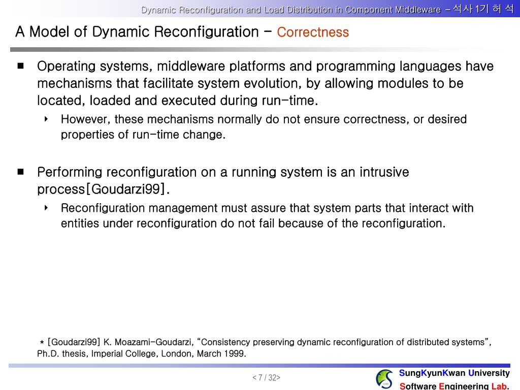 “Dynamic Reconfiguration and Load Distribution in Component Middleware" "Maarten Wegdam" "CTTI PhD.-thesis series number 03-50 Telematica Instituut Fundamental Research Series, No. 009 (TI/FRS/009) 85 ~ 126 page" 10월28일 Software Engineering Lab. 석사 1기 허 석