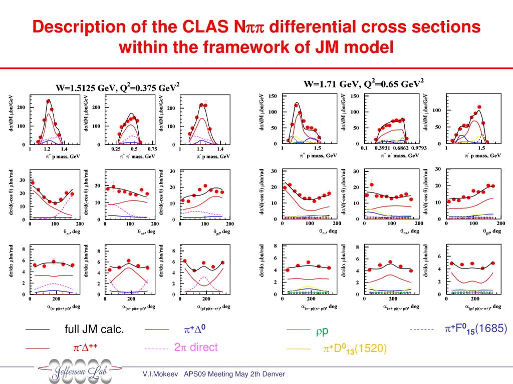 Conclusions and outlook • Phenomenological approach JM has been developed by the CLAS Collaboration with the goal of determining N* electrocouplings from combined fits of measured observables in Npp electroproduction data. • A good description of the CLAS data on p+p-p differential cross sections has been achieved, affording us to access the resonant parts of amplitudes, which are directly related to N* electrocouplings. • The P11(1440) and D13(1520) electrocouplings have been determined for the first time Npp dataset. • The consistent results extracted from Np & Npp channels strongly indicate a reliable electrocoupling measurement. • Analysis of the Npp CLAS data provides first-time information on the electrocouplings for D33(1700) & P13(1720) resonances that decay primarily to the Npp final states . • Comprehensive data on electrocouplings of almost all well established excited proton states with masses less than 1.8 GeV at photon virtualities from 0.5 to 1.5 GeV2 will be obtained from analysis of p+p-p electroproduction by the first half of 09’. Eventually analysis will be extended for photon virtualitulities 1.5<Q2<5.0 GeV2. The CLAS p+p-p data at W<2.0 GeV and 1.5<Q2<5.0 GeV2 are close to completion