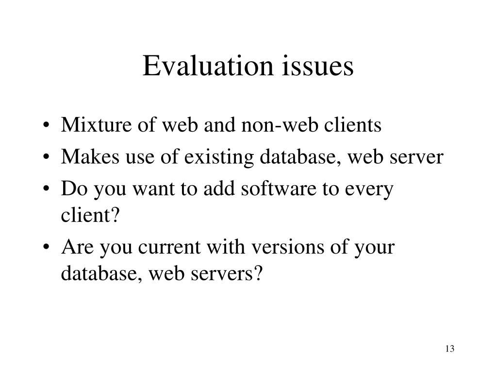 Evaluation issues • Mixture of web and non-web clients • Makes use of existing database, web server • Do you want to add software to every client? • Are you current with versions of your database, web servers?