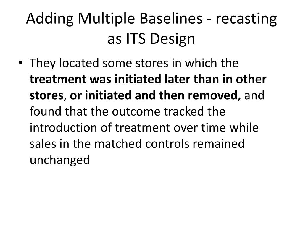 Adding Multiple Baselines - recasting as ITS Design • They located some stores in which the treatment was initiated later than in other stores, or initiated and then removed, and found that the outcome tracked the introduction of treatment over time while sales in the matched controls remained unchanged
