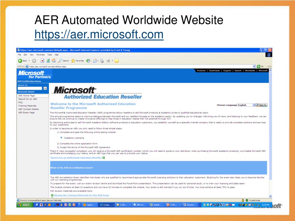 Статус AER– для партнеров продающих академические лицензии Microsoft. Обзор программы AER. Программа Authorized Education Reseller (AER) существует для того, чтобы у c тановить контакт и плотнее работать с реселлерами, продающими на рынке в сегмент образования. Пррограмма AER помогает :