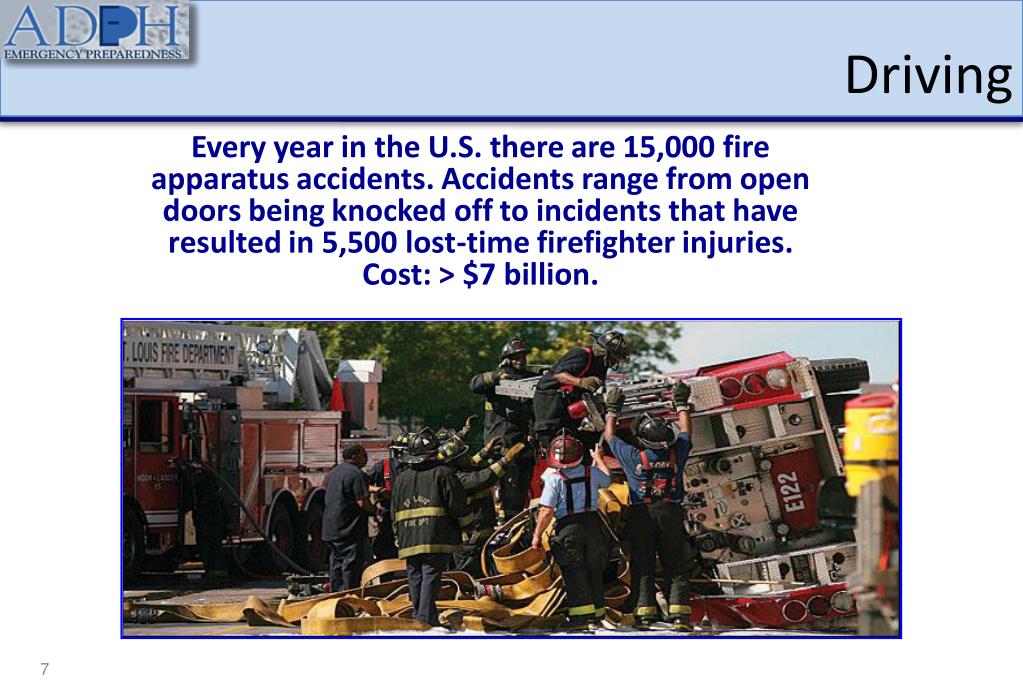 Driving Every year in the U.S. there are 15,000 fire apparatus accidents. Accidents range from open doors being knocked off to incidents that have resulted in 5,500 lost-time firefighter injuries. Cost: > $7 billion.