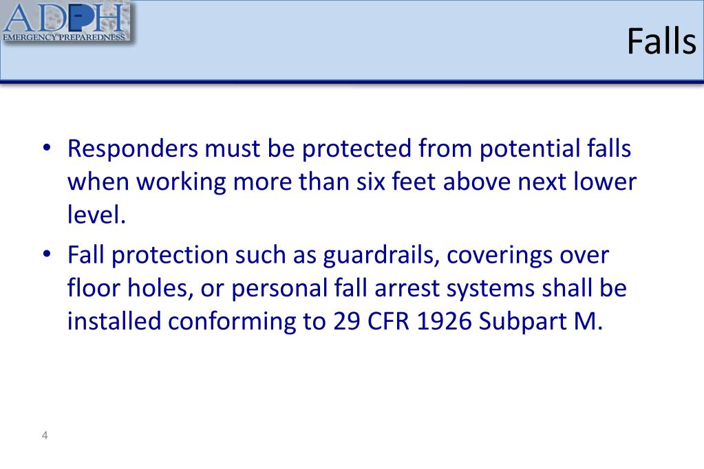 Falls • Responders must be protected from potential falls when working more than six feet above next lower level. • Fall protection such as guardrails, coverings over floor holes, or personal fall arrest systems shall be installed conforming to 29 CFR 1926 Subpart M.