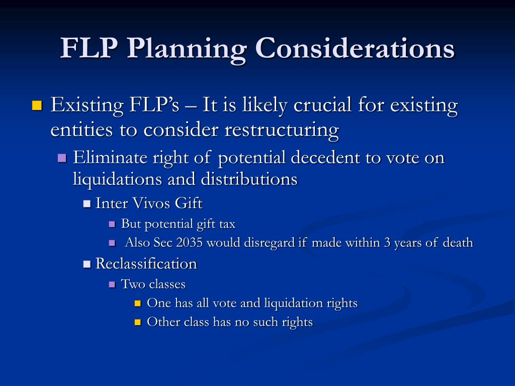 FLP Planning Considerations • Existing FLP’s – It is likely crucial for existing entities to consider restructuring • Eliminate right of potential decedent to vote on liquidations and distributions • Inter Vivos Gift • But potential gift tax • Also Sec 2035 would disregard if made within 3 years of death • Reclassification • Two classes • One has all vote and liquidation rights • Other class has no such rights