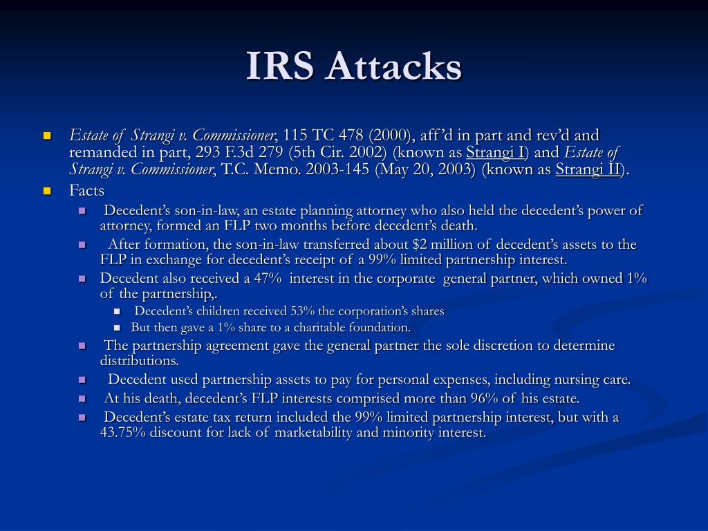 IRS Attacks • Estate of Strangi v. Commissioner, 115 TC 478 (2000), aff’d in part and rev’d and remanded in part, 293 F.3d 279 (5th Cir. 2002) (known as Strangi I) and Estate of Strangi v. Commissioner, T.C. Memo. 2003-145 (May 20, 2003) (known as Strangi II). • Facts • Decedent’s son-in-law, an estate planning attorney who also held the decedent’s power of attorney, formed an FLP two months before decedent’s death. • After formation, the son-in-law transferred about $2 million of decedent’s assets to the FLP in exchange for decedent’s receipt of a 99% limited partnership interest. • Decedent also received a 47% interest in the corporate general partner, which owned 1% of the partnership,. • Decedent’s children received 53% the corporation’s shares • But then gave a 1% share to a charitable foundation. • The partnership agreement gave the general partner the sole discretion to determine distributions. • Decedent used partnership assets to pay for personal expenses, including nursing care. • At his death, decedent’s FLP interests comprised more than 96% of his estate. • Decedent’s estate tax return included the 99% limited partnership interest, but with a 43.75% discount for lack of marketability and minority interest.
