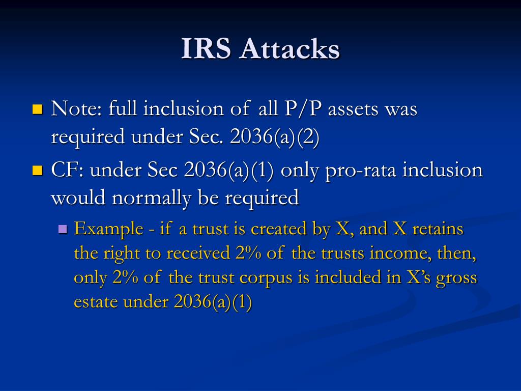 IRS Attacks • Note: full inclusion of all P/P assets was required under Sec. 2036(a)(2) • CF: under Sec 2036(a)(1) only pro-rata inclusion would normally be required • Example - if a trust is created by X, and X retains the right to received 2% of the trusts income, then, only 2% of the trust corpus is included in X’s gross estate under 2036(a)(1)