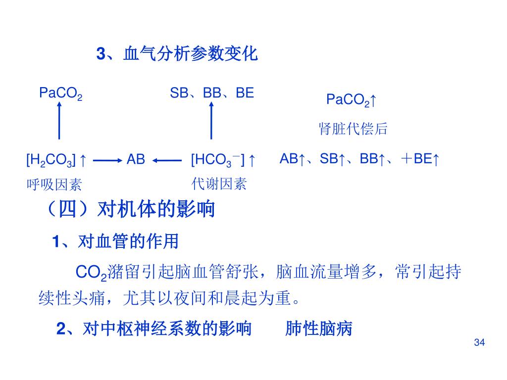 PaCO2 SB、BB、BE PaCO2↑ 肾脏代偿后 AB↑、SB↑、BB↑、+BE↑ [H2CO3] ↑ AB [HCO3-] ↑ 代谢因素 呼吸因素 3、血气分析参数变化 (四)对机体的影响 1、对血管的作用 CO2潴留引起脑血管舒张,脑血流量增多,常引起持续性头痛,尤其以夜间和晨起为重。 2、对中枢神经系数的影响 肺性脑病
