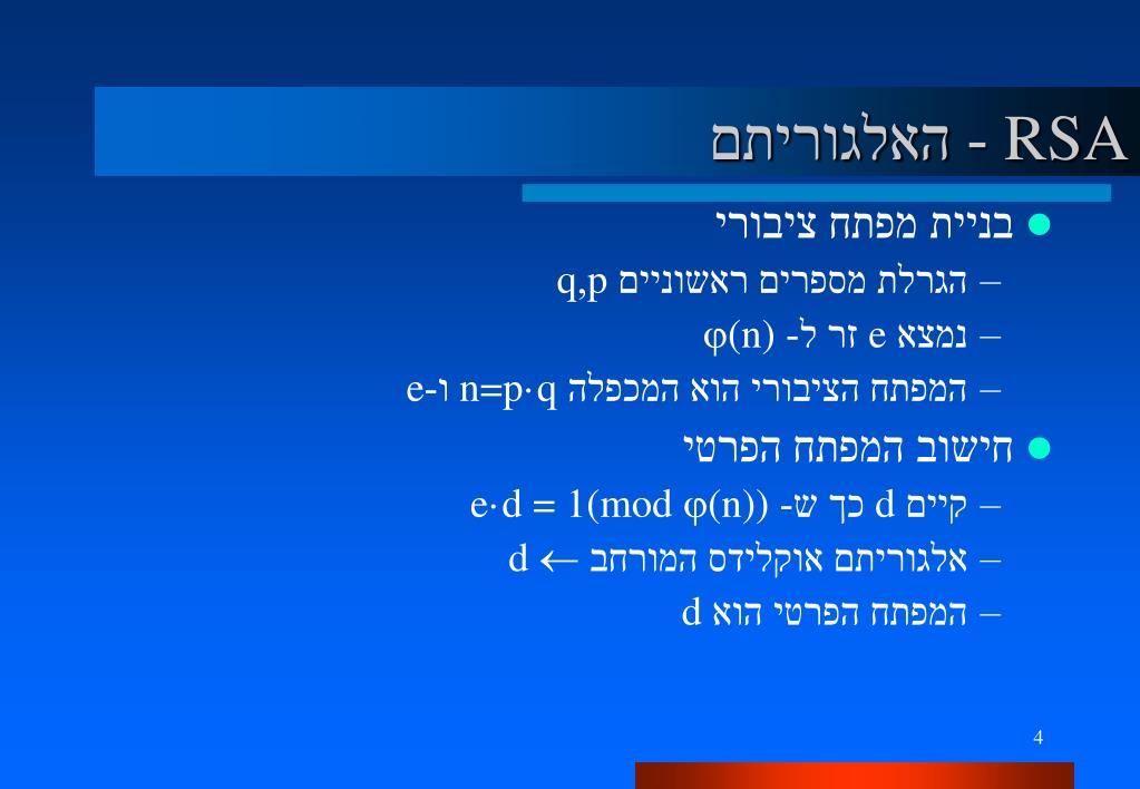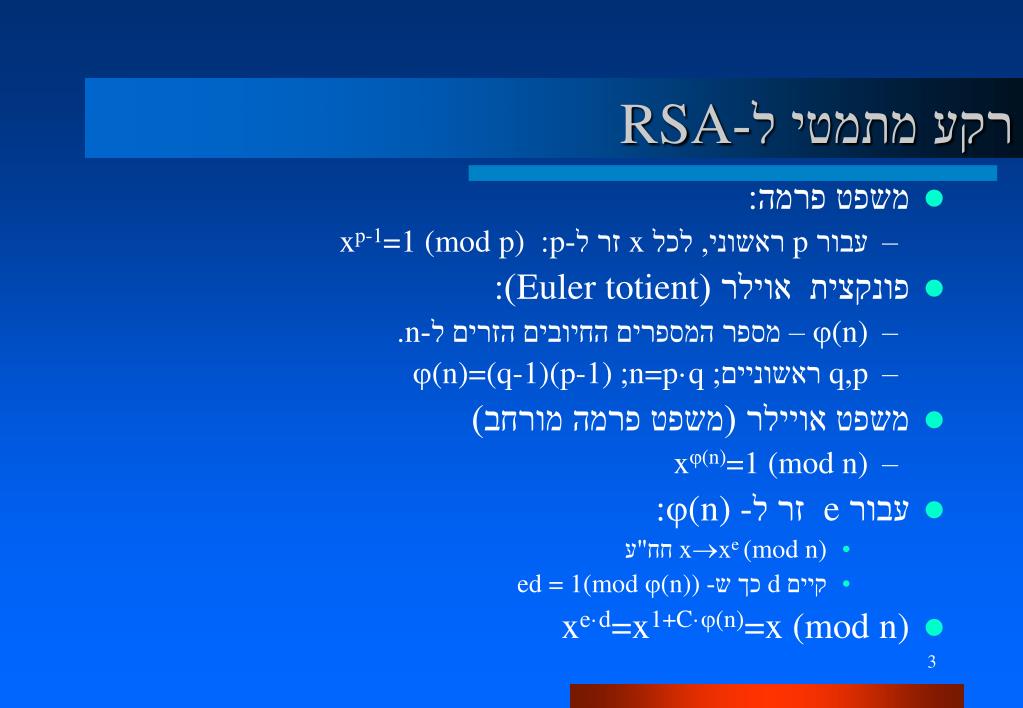 רקע מתמטי ל-RSA • משפט פרמה: • עבור p ראשוני, לכל x זר ל-p: xp-1=1 (mod p) • פונקצית אוילר (Euler totient): • (n) – מספר המספרים החיובים הזרים ל-n. • p,q ראשוניים; n=p·q; (n)=(q-1)(p-1) • משפט אויילר (משפט פרמה מורחב) • x(n)=1 (mod n) • עבור e זר ל- (n): • xxe (mod n) חח"ע • קיים d כך ש- ed = 1(mod (n)) • xe·d=x1+C·(n)=x (mod n)