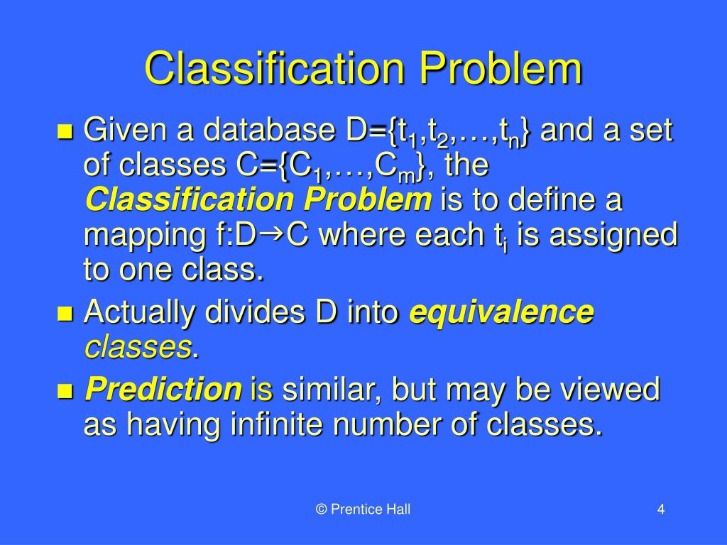 Classification Problem • Given a database D={t1,t2,…,tn} and a set of classes C={C1,…,Cm}, the Classification Problem is to define a mapping f:DgC where each ti is assigned to one class. • Actually divides D into equivalence classes. • Predictionis similar, but may be viewed as having infinite number of classes. © Prentice Hall
